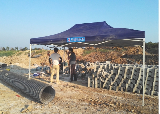 考虑到施工现场无庇荫处,项目部还在现场搭置了防晒棚,并摆放饮用水、绿豆汤、防暑药品,供施工人员休息、补给。同时,项目部集中采购了一批人丹、藿香正气液、风油精、绿豆及急救药箱等防暑降温物品进行分发。