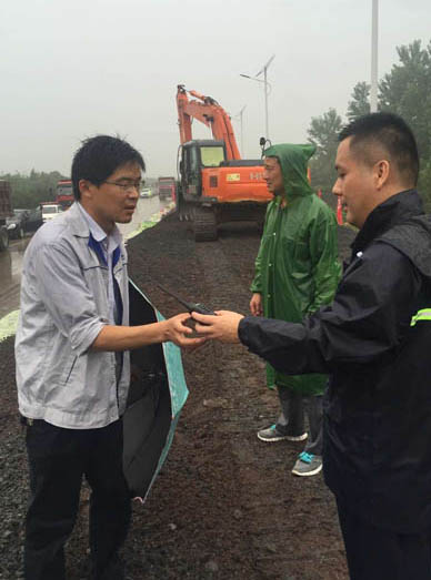 (图为胡计划在防汛一线执行任务,左一)