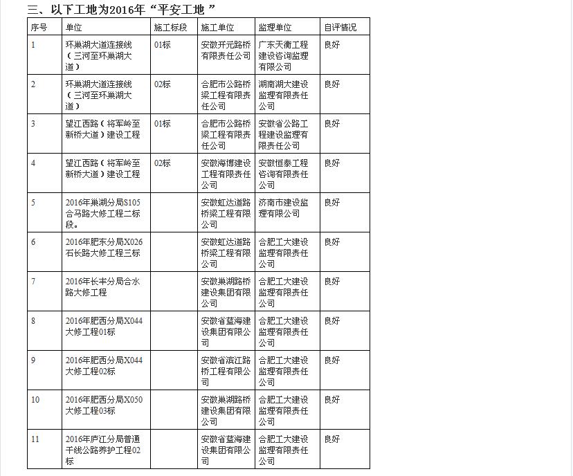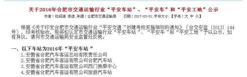 关于2016年合肥市交通运输行业“平安车站”、“平安车”和“平安工地”公示