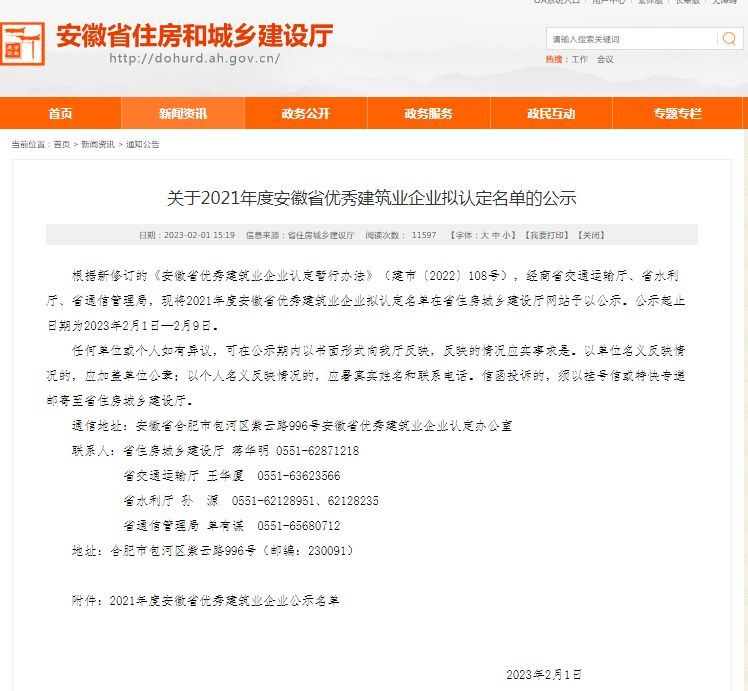 据悉,2021年度安徽省优秀建筑业企业评选是安徽省住房和城乡建设厅、安徽省交通运输厅、安徽省水利厅联合开展的第二届认定评选活动。评选标准分别从社会责任履行、企业经营发展、企业管理创新、企业建造能力、亚洲欧美日韩综合色建设等方面进行评定,是对建筑业企业能力的综合认定。