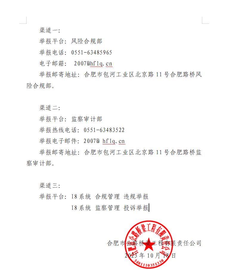 关于开通合肥路桥合规举报渠道的通知