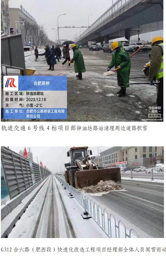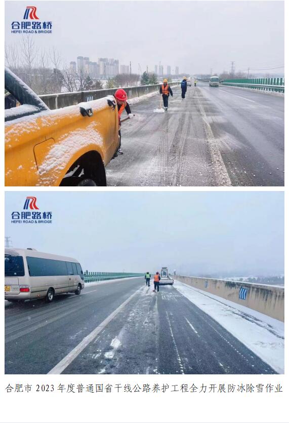 据合肥市气象预报寒潮来袭,为保障国省干线公路安全畅通,公司在建项目合肥市2023年度普通国省干线公路养护工程(第二批一标段)项目经理部迅速组建极端天气应急小组,加强一线人员、物资、机械调度,全力开展防冰除雪作业。18日,经过一天的奋战,项目养护路段主干道、桥梁、急弯陡坡、临水临崖等路段积雪全部清除完毕。