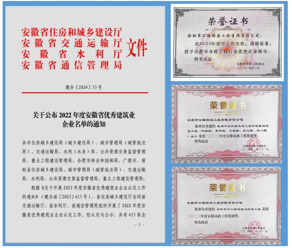 近日,从安徽省住房和城乡建设厅、安徽省市政工程协会传来喜讯,合肥路桥斩获“安徽省优秀建筑业企业”“合肥市市政工程行业优秀企业”等多项荣誉。此外,公司承建的巢湖半岛人居环境工程、阜阳市河口路工程荣获安徽省市政工程优质奖。