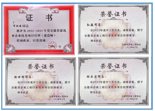 孙巍、杨世炜、杨庆忠3位同志荣获“合肥市市政工程行业优秀项目经理”称号,宋祖安同志荣膺“安徽省建筑业企业优秀项目经理”称号。