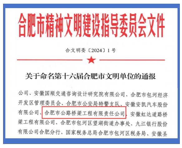 近日,合肥市精神文明建设指导委员会公布了《关于命名第十六届合肥市文明单位的通报》(合文明委〔2024〕1号),合肥路桥荣获第十六届“合肥市文明单位”称号。