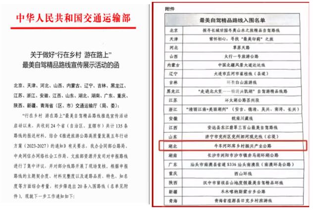 近日,交通运输部新闻办公室发布“行在乡村游在路上”最美自驾精品路线入围名单,全国共有20条线路入围,由合肥路桥承建的湖北省团风县牛车河环库乡村振兴产业公路榜上有名。