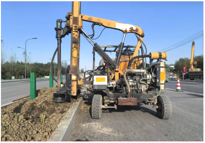近日,在G312合六路(肥西段)快速化改造工程中分带防撞护栏施工现场,一款“吸尘器”钻孔机进入大家视野,随着旋钻头的落下,没有传统施工的灰尘扑扑,这就是该项目最新引进的打桩“神器”——集护栏立柱打桩、钻孔、粉尘回收等多功能为一体的多功能防撞护栏立柱打桩机。