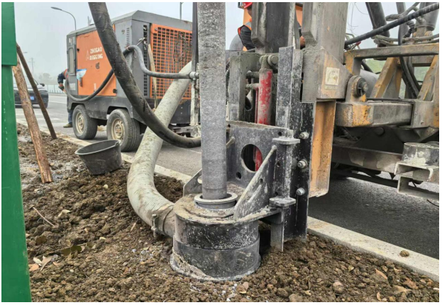 G312合六路(肥西段)快速化改造工程为老路改建项目,经过历次改建,中分带基层多为水泥混凝土板块,防撞护栏立柱施工必须钻孔,以往传统的防撞护栏立柱钻孔,耗时、耗力,极易产生扬尘,经过改装后的钻孔机粉尘吸净率高达98%,排放满足PM2.0,无需洒水车扫刷即可让粉尘等全面回收,不仅节省了车辆及人工成本,还解决了钻孔对周边环境的扬尘污染,这对环保施工具有重要意义。