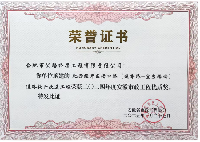日前,安徽省市政工程协会就2024年度安徽市政工程优质奖评选结果就行了公布,合肥路桥肥西经开区汤口路(延乔路-宜秀路西)道路提升改造工程荣登榜单。