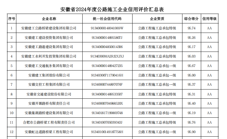 据悉,合肥路桥已连续14年获评安徽省公路施工企业AA级信用评价。该评价既是对合肥路桥多年来坚守品质、追求卓越的高度认可,更是企业“精品立业 谋福大众”理念的生动诠释。