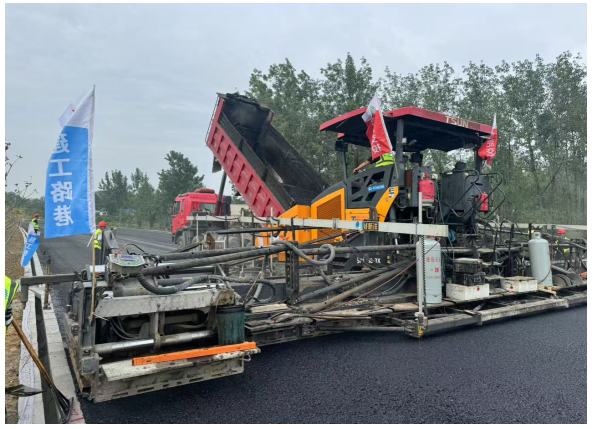 作为“首件工程”,此次试验段严格遵循相关规范标准,建设单位与监理公司全程参与、严格监控。从沥青、集料等原材料进场的源头把控,到每一道施工工序的现场检测,均建立起了一套严密且完整的质量管控体系。摊铺作业采用大宽度摊铺机施工,确保了路面横坡,同时根据现场实际情况,动态调整摊铺机速度与振捣频率,有效控制了路面的均匀性;压实环节采用多机型组合碾压,验证了不同碾压工艺对路面密实度的影响。