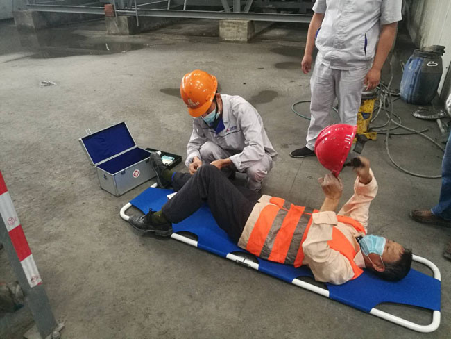 事件模拟真实事故,一名维修工人在对设备保养时不慎从滚筒平台滑落,造成腿部受伤,随后拌和站负责人紧急启动安全事故应急预案,把伤者送医救治。演练现场,作业人员熟练掌握应急救援运行的程序和方法,在了解和掌握了发生事故后及时上报情况,各责任组配合密切,各个环节,流程衔接顺利,协调组织有序,物资到位及时。