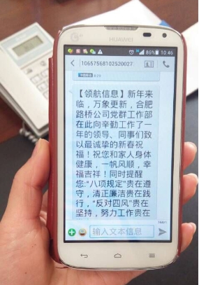 “新年来临,万象更新,合肥路桥公司党群工作部在此向辛勤工作了一年的领导、同事们致以最诚挚的新春祝福!祝您和家人身体健康,一帆风顺,幸福吉祥!同时提醒您:“八项规定”贵在遵守,清正廉洁贵在践行,“反对四风”贵在坚持,努力工作贵在常态。”日前,合肥路桥公司党员干部陆续收到了这样的一条廉洁祝福短信,这是公司新年送出的一份特殊“礼物”。