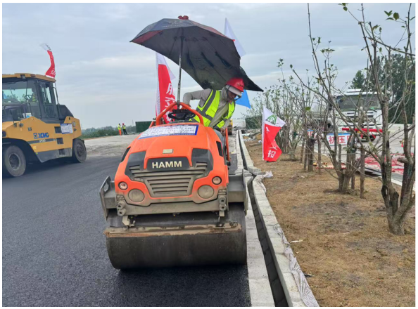 作为“首件工程”,此次试验段严格遵循相关规范标准,建设单位与监理公司全程参与、严格监控。从沥青、集料等原材料进场的源头把控,到每一道施工工序的现场检测,均建立起了一套严密且完整的质量管控体系。摊铺作业采用大宽度摊铺机施工,确保了路面横坡,同时根据现场实际情况,动态调整摊铺机速度与振捣频率,有效控制了路面的均匀性;压实环节采用多机型组合碾压,验证了不同碾压工艺对路面密实度的影响。