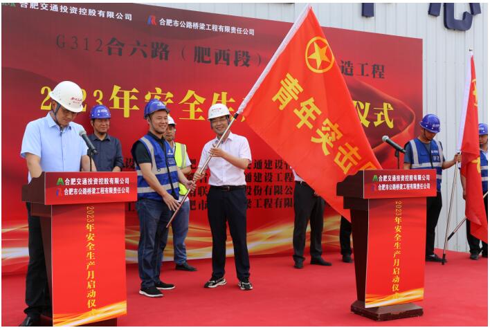 合肥交投合六项目公司副总经理周恒星主持活动仪式。启动仪式上,陈风明代表建设单位向项目青年突击队授旗,杨枫代表施工单位向项目党员先锋岗授旗,项目经理孙巍代表项目部发起“安全生产月”活动倡议。
